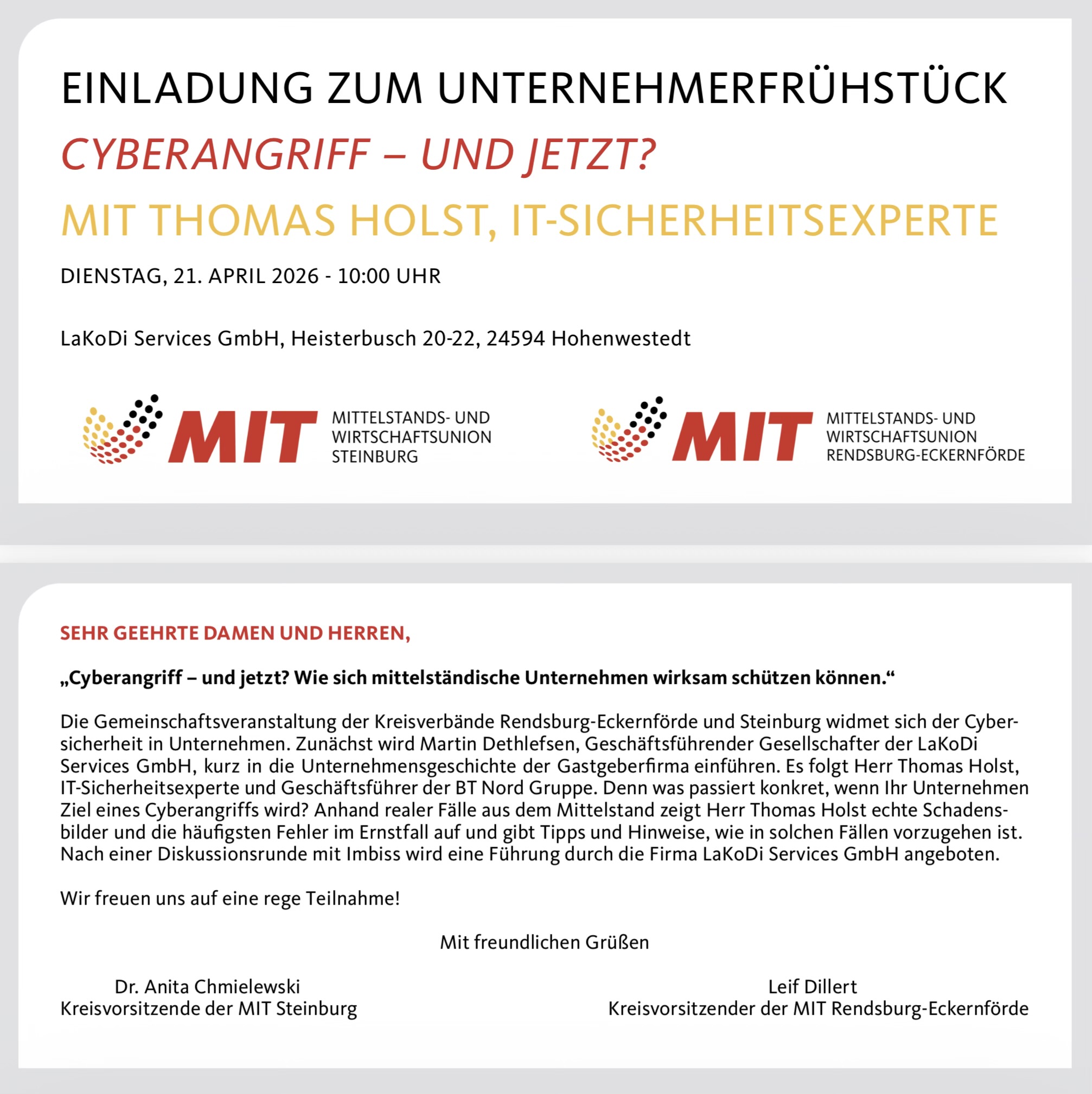 Es folgt Herr Thomas Holst, IT-Sicherheitsexperte und Geschäftsführer der BT Nord Gruppe. Denn was passiert konkret, wenn Ihr Unternehmen Ziel eines Cyberangriffs wird? Anhand realer Fälle aus dem Mittelstand zeigt Herr Thomas Holst echte Schadensbilder und die häufigsten Fehler im Ernstfall auf und gibt Tipps und Hinweise, wie in solchen Fällen vorzugehen ist.