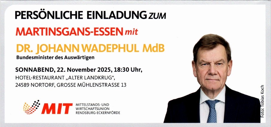 Die Mittelstands- und Wirtschaftsunion (MIT) im Kreis Rendsburg-Eckernförde lädt wieder ein zum traditionellen Martinsgans-Essen am Samstag, den 22. November 2025 ab 18:30 in das Hotel-Restaurant ALTER LANDKRUG in Nortorf. Unser politischer Ehrengast wird in diesem Jahr unser Bundesaußenminister Dr. Johann Wadephul, MdB sein.