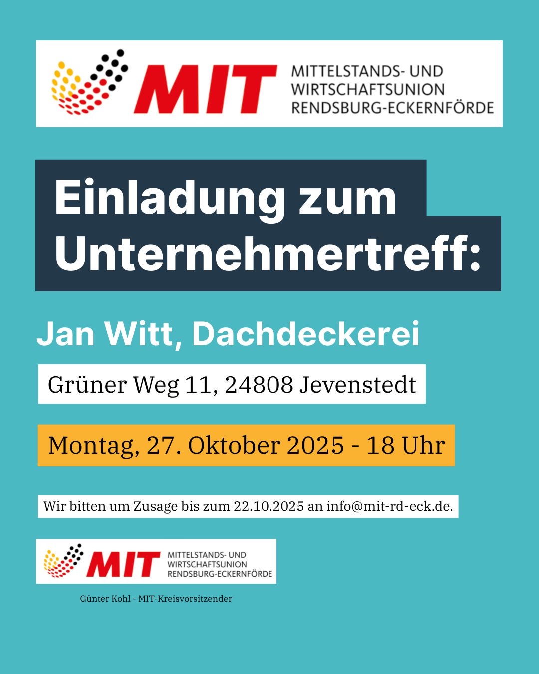 Die MIT Rendsburg-Eckernförde lädt herzlich ein zum Unternehmertreff bei der Dachdeckerei Jan Witt in Jevenstedt.